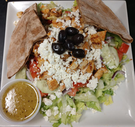 Charbroiled chicken breast, romaine lettuce, cucumbers, tomatoes, red onions,